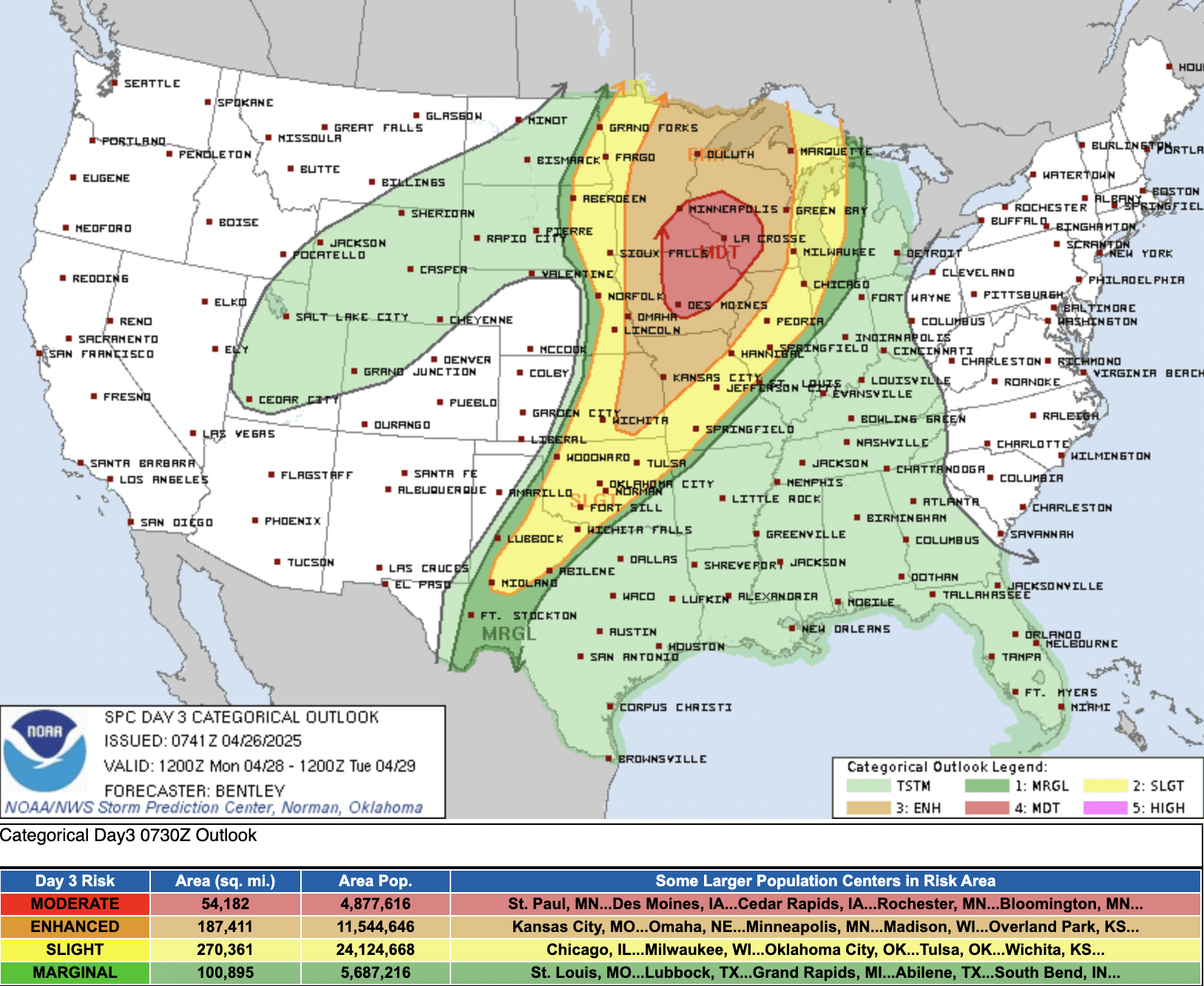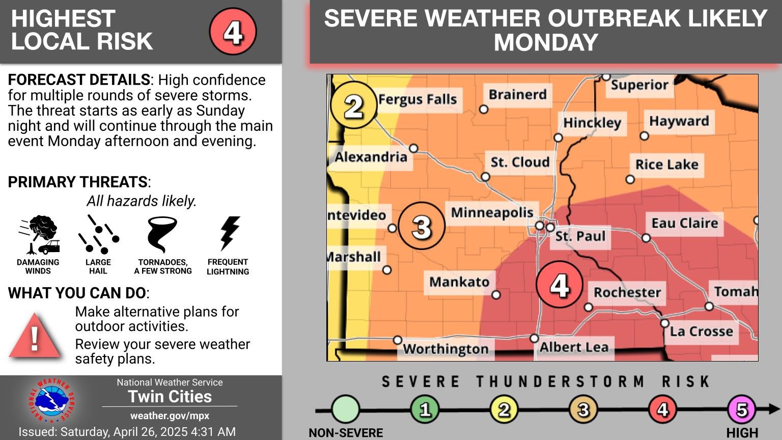 “A very serious situation is expected to unfold Monday. Scattered supercells capable of strong tornadoes are expected to develop in the Moderate Risk area. It’s rare for such a risk on day 3 anywhere, but especially here,” says Bill Borghoff, a senior meteorologist with the National Weather Service office in Chanhassen.