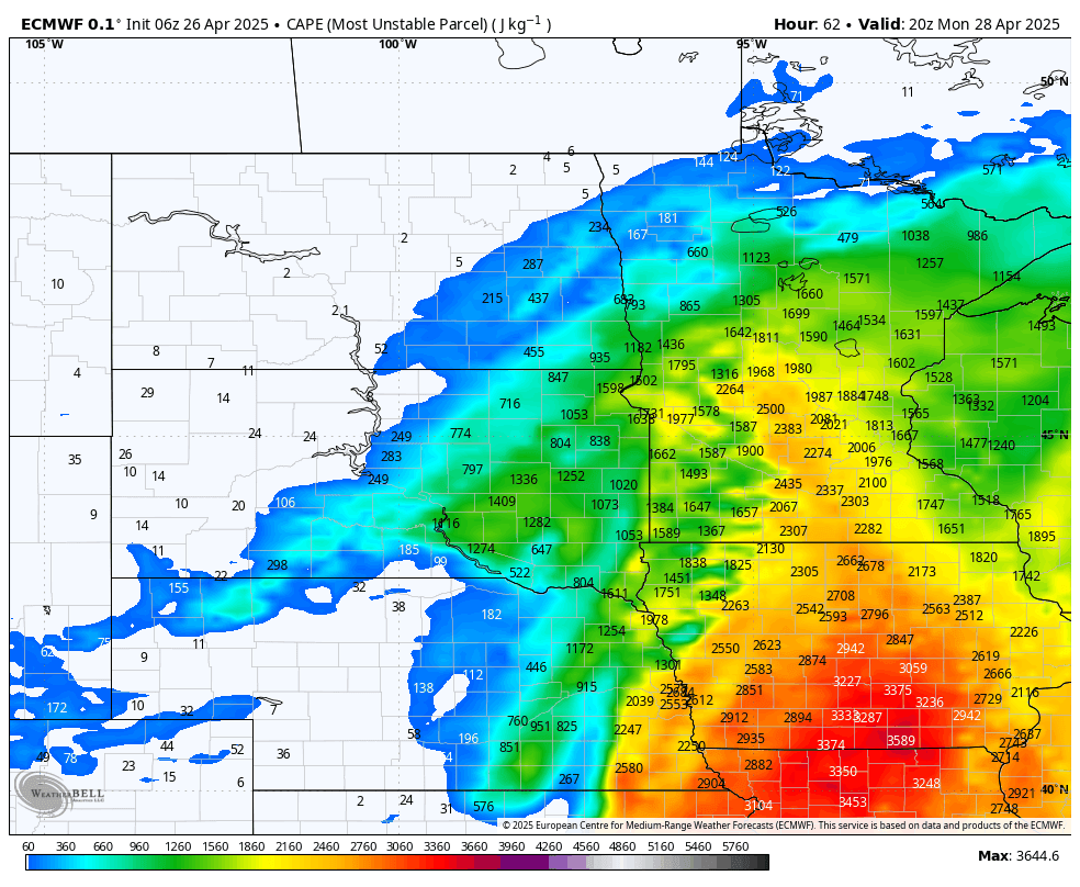 By 3 p.m. Monday, temps will be plenty warm in the 70s and 80s and dew points will be in the mid 60s. There will be more than enough CAPE (Convective Available Potential Energy) for instability and explosive storm development.