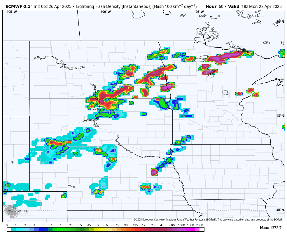 The European model’s lightning forecast simulation from 1 p.m. Monday to 1 a.m. Tuesday shows early afternoon development in western Minnesota and intensification as the storms move east toward places like Mankato, the Twin Cities, Rochester, Eau Claire and La Crosse.